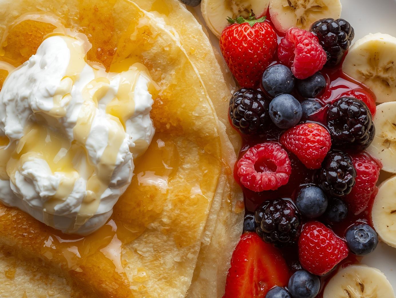 Two crêpes, Homemade berry compote, Coconut Yogurt, Fruit slices, honey